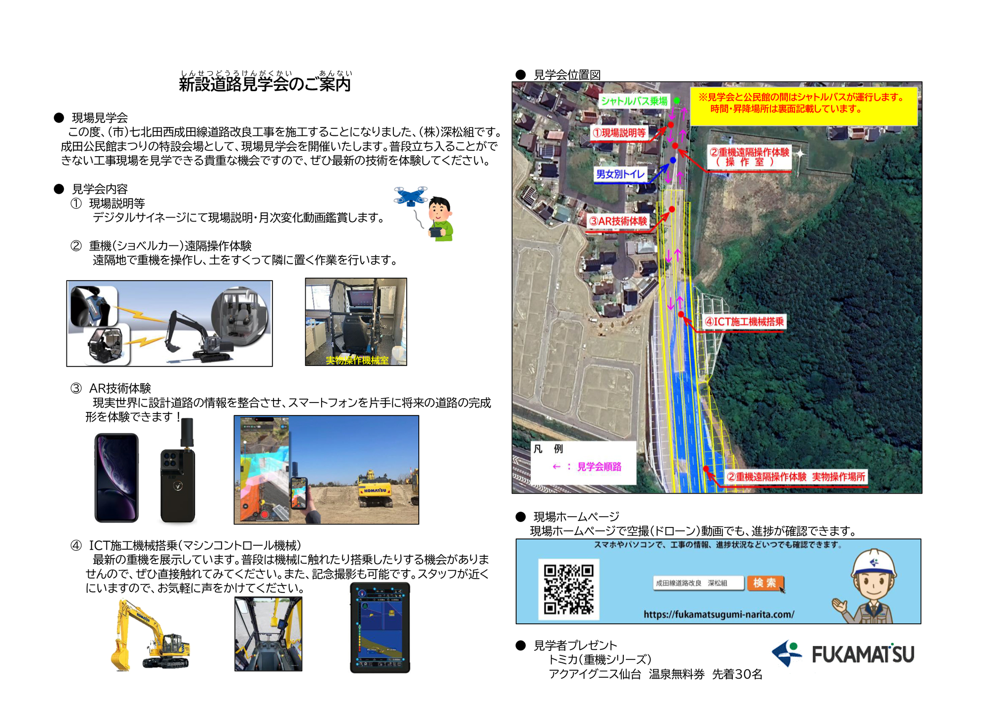 10月19日(日)に成田公民館まつりの特設会場として現場見学会を行います。開催時間は、10:30~14:30までです。また、成田公民館からシャトルバスを運行します。見学会の場所、シャトルバス運行時刻表など、詳しい内容は下記をご覧ください。